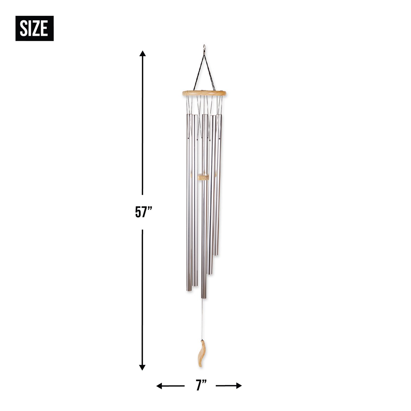 • The wind chimes weighs 3.4 lbs and measures 7" diameter x 57" high. The logest pole is aprox. 33" Each pole is 1" in diameter. These need a minimum 5 feet space to hang them in for the clapper to swing freely.
