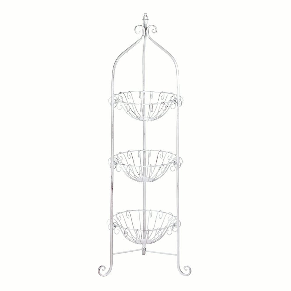 • Three curled metal wire baskets stand in a metal frame, complete with curled feet and a finial on top. Fill it with three of your favorite plants or blooms, or let your imagination fill these baskets with whatever you'd like to display.