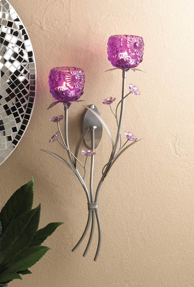 Light your wall with brilliant fuchsia shine from this stunning floral candle holder wall sconce. Silvery stems hold delicate flowers and two flowery candle cups that are ready for the candles of your choice. Item weight: 1.6 lbs. 8¢" x 4¢" x 17?" high. Iron, glass and acrylic. Candles not included. UPC: 849179017088.