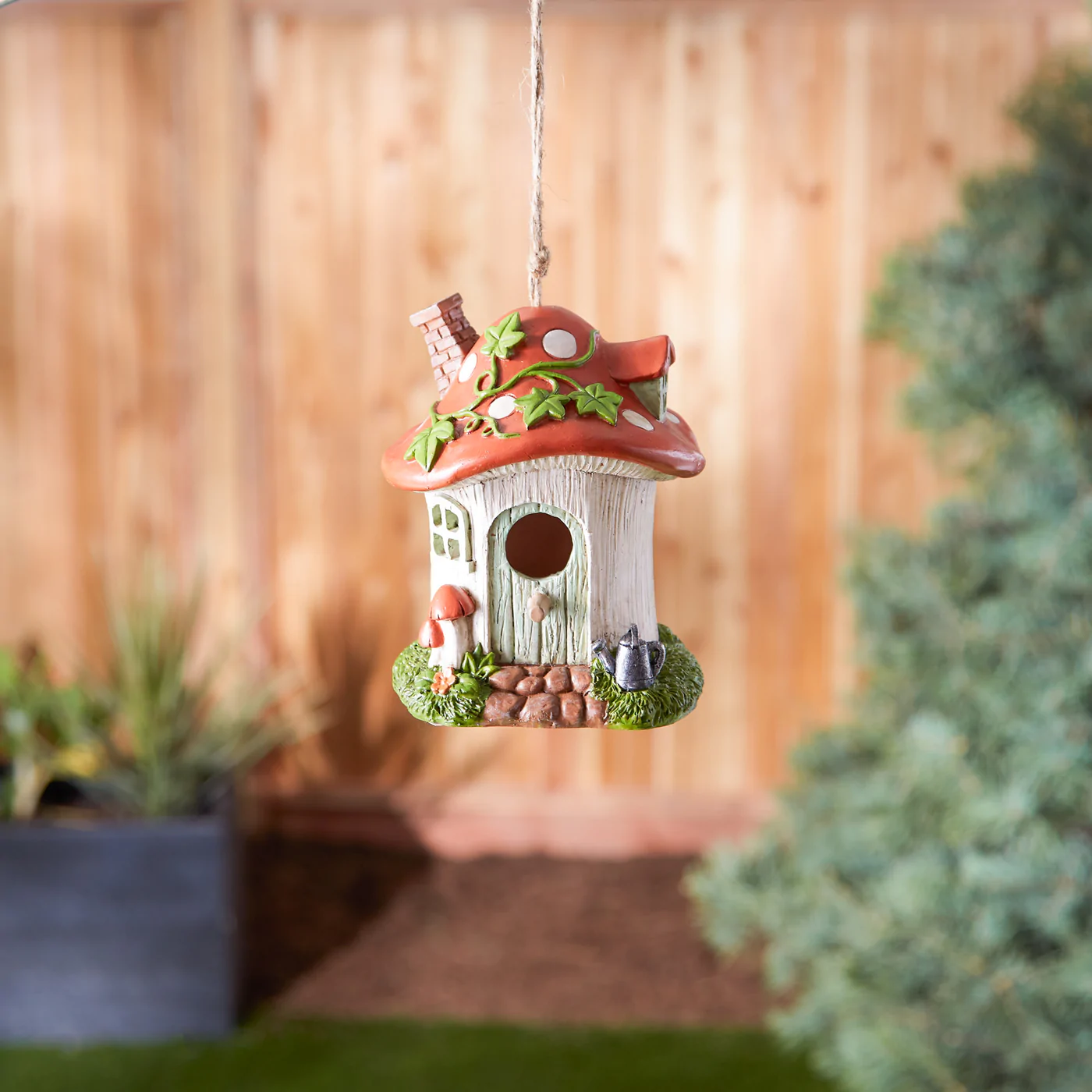 • This adorable mushroom birdhouse will add colorful charm to your outdoor space while providing a fun home for the birds in your yard.