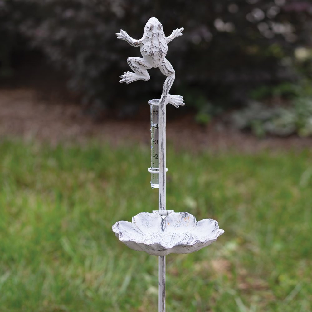 Our Leapfrog Rain Gauge Includes a birdseed dish and a clear plastic gauge that measures up to 5'' of rainwater. This item breaks down for easy shipping and storage.