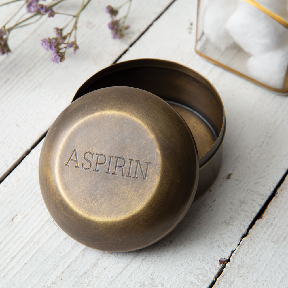 Place this antique brass pill box on your counter for a vintage look and place small trinkets inside. This box is made of metal and reads aspirin on its top. The item is not intended to place actual medication inside.