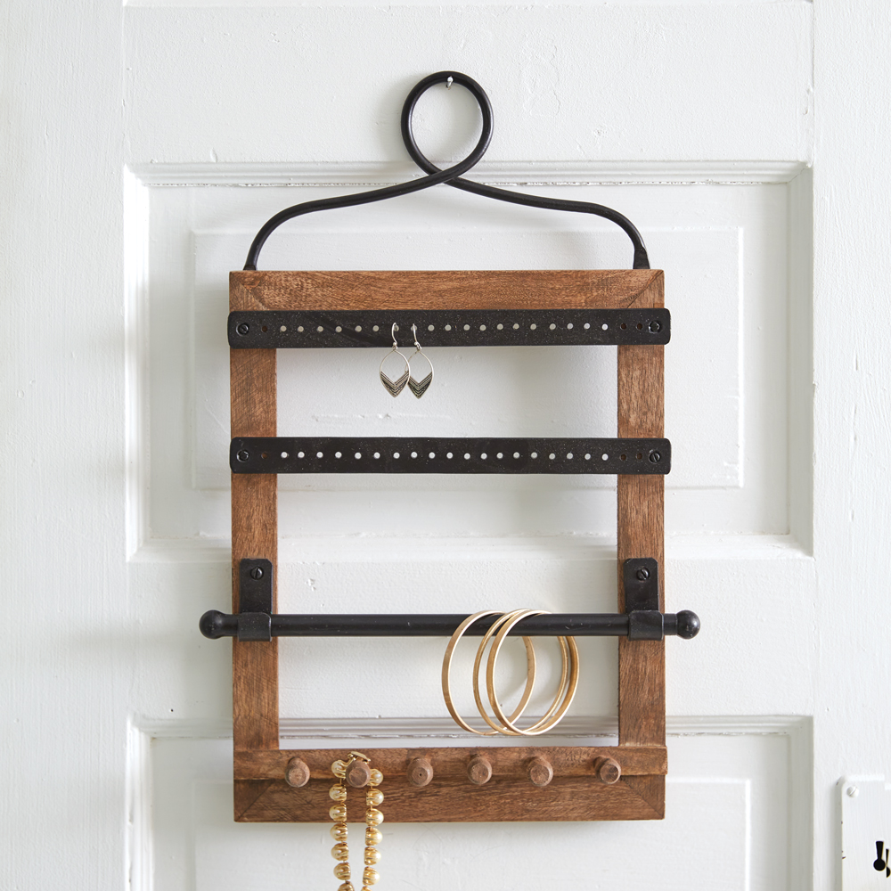 Collect all of your jewelry in one place with this hanging display. It features two rows for earrings, one row for bracelets, and one row for necklaces. Item is made of wood and metal. To hang, use its metal loop.