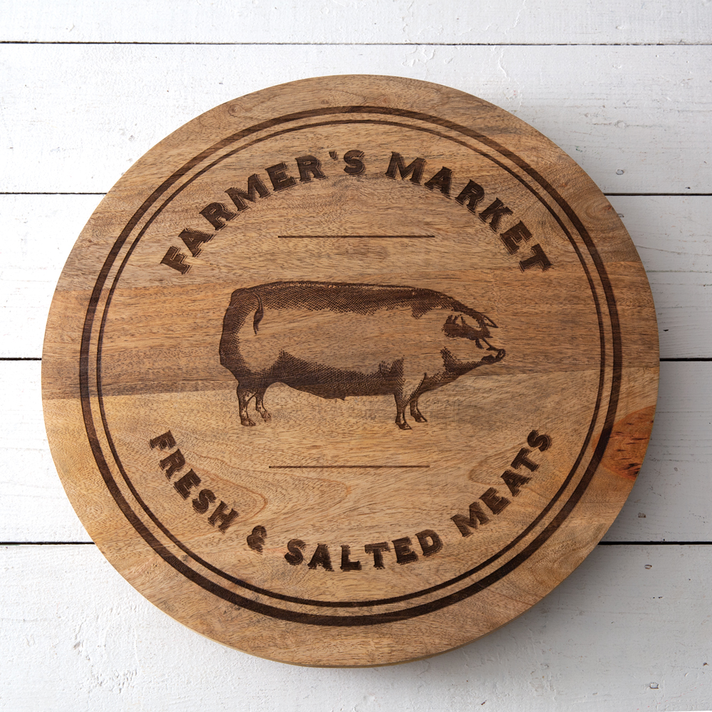 This farmhouse lazy susan features ''Farmer's Market Fresh Salted Meats'' and a pig on its front. Item is made of wood and spins on its base. Display in the center of a dining table to easily distribute food.